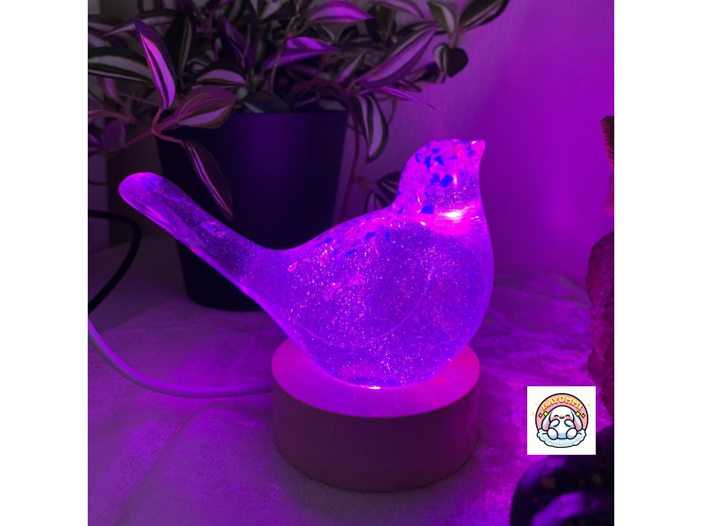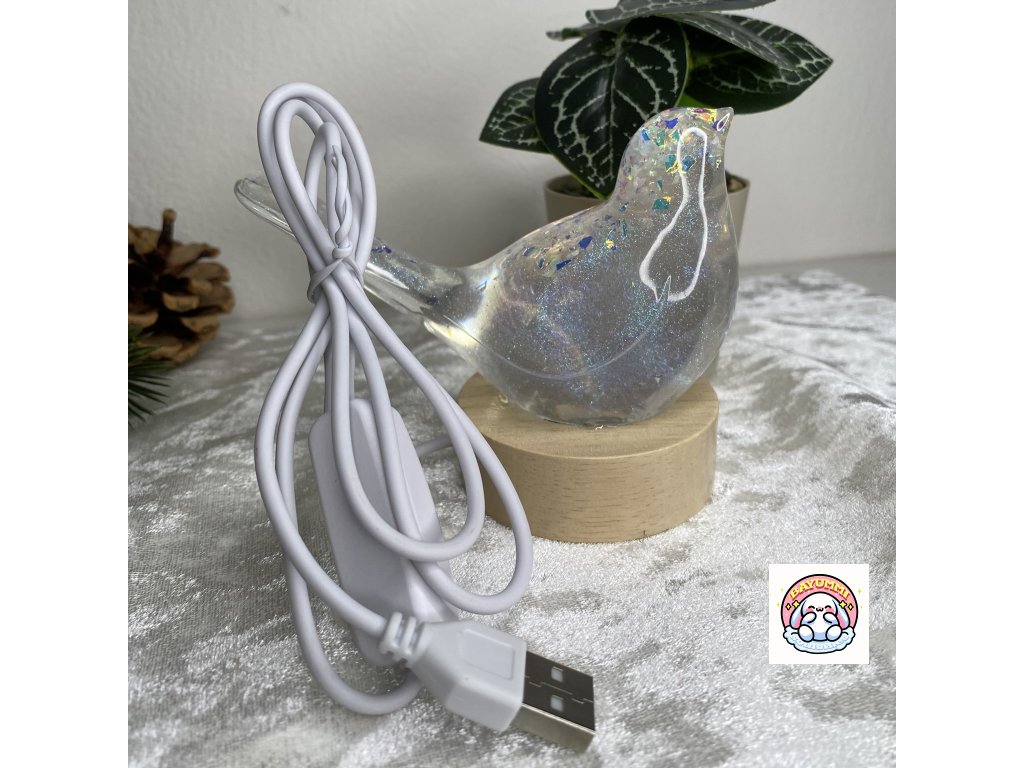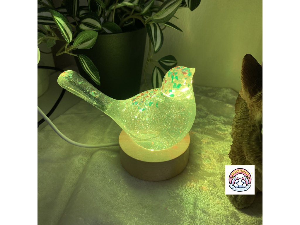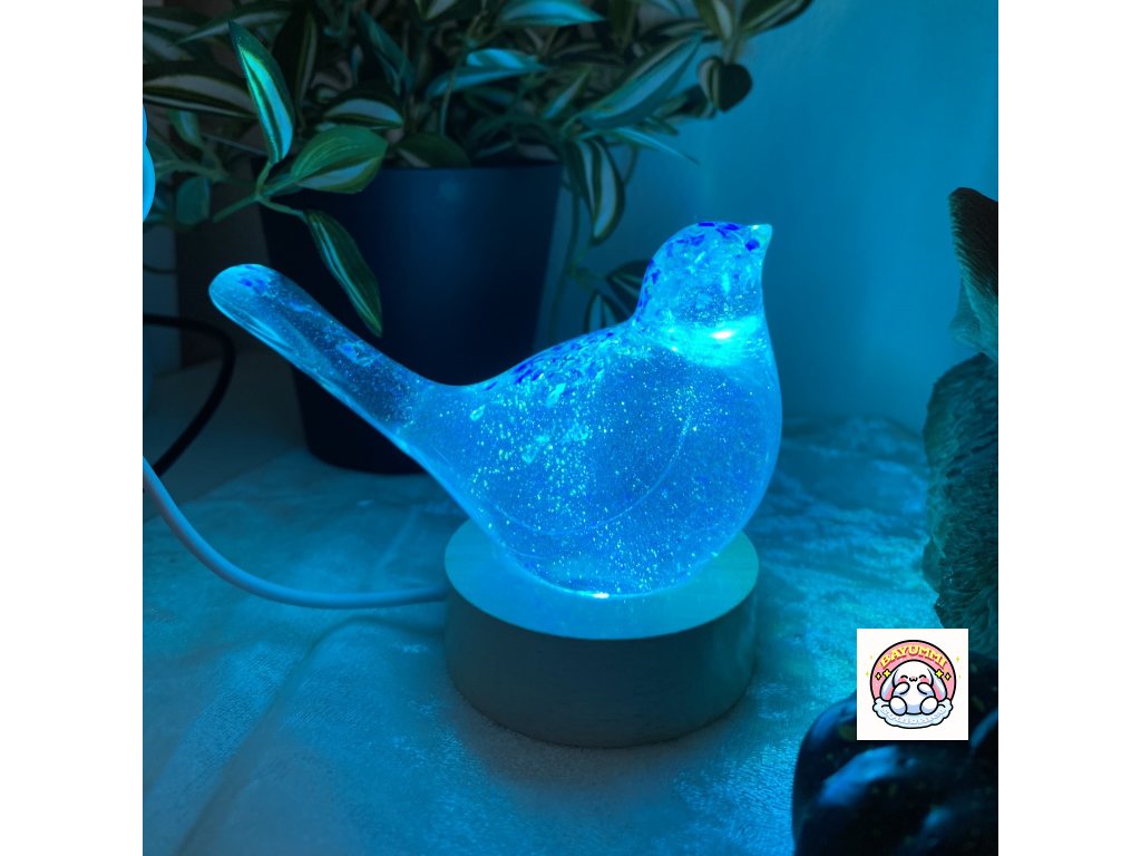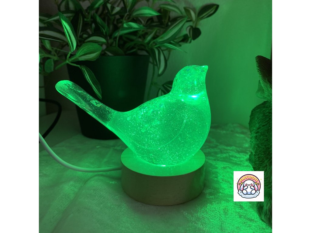 Pryskyřicový ptáček na dřevěném led podstavci na usb. Světélko mění barvy.