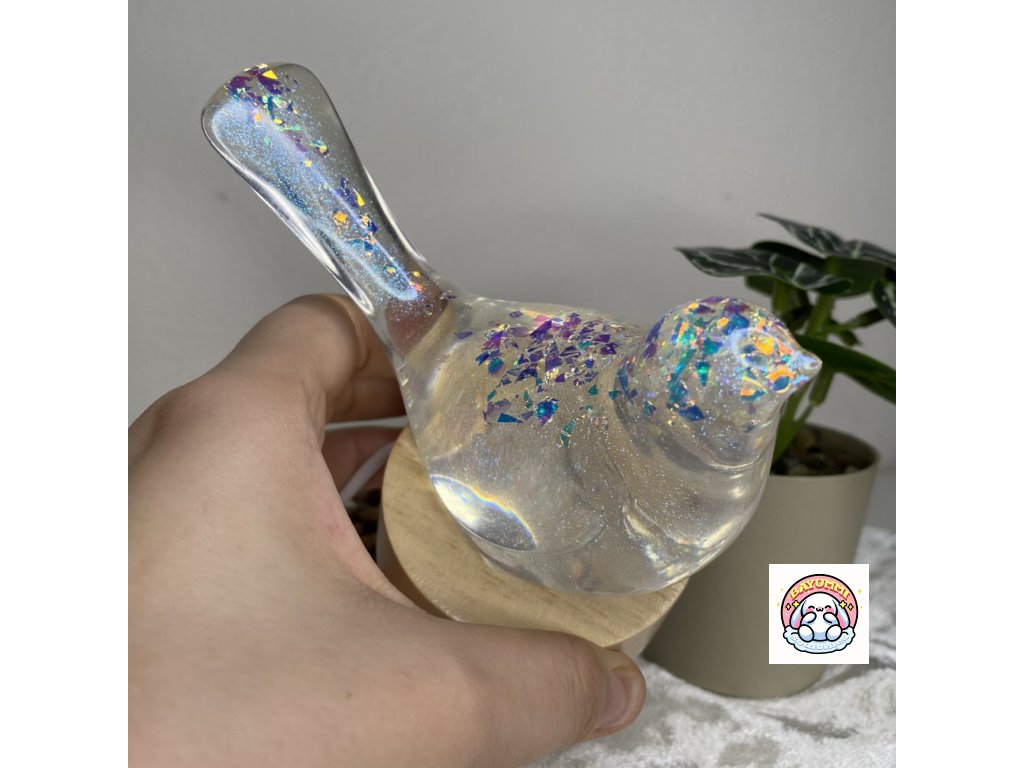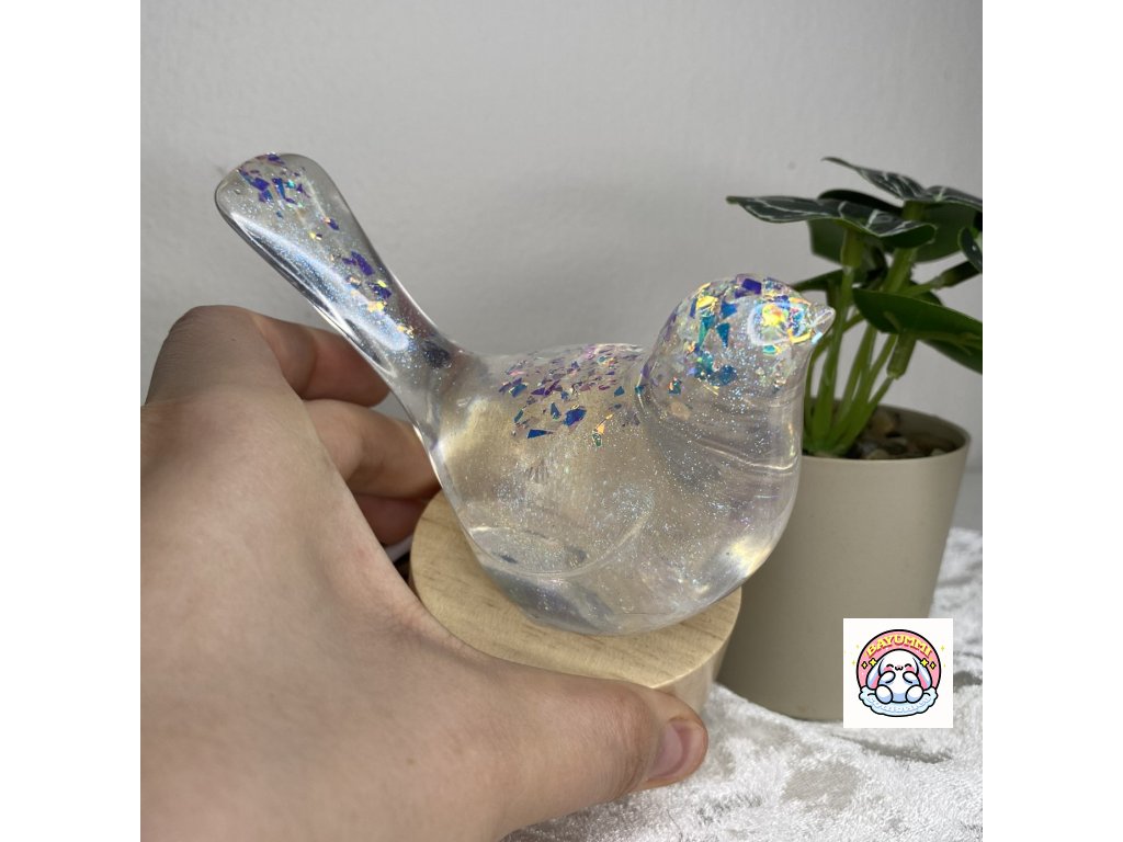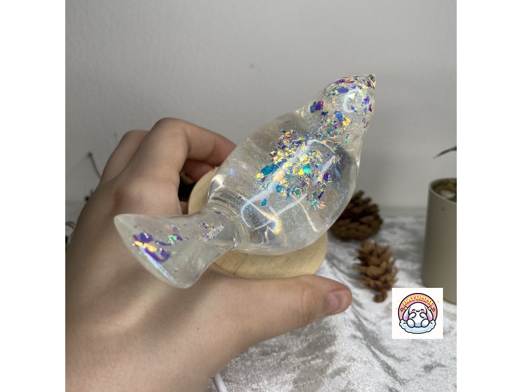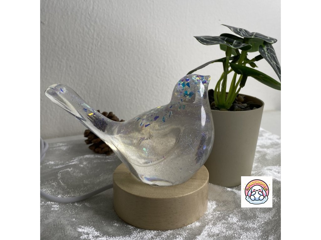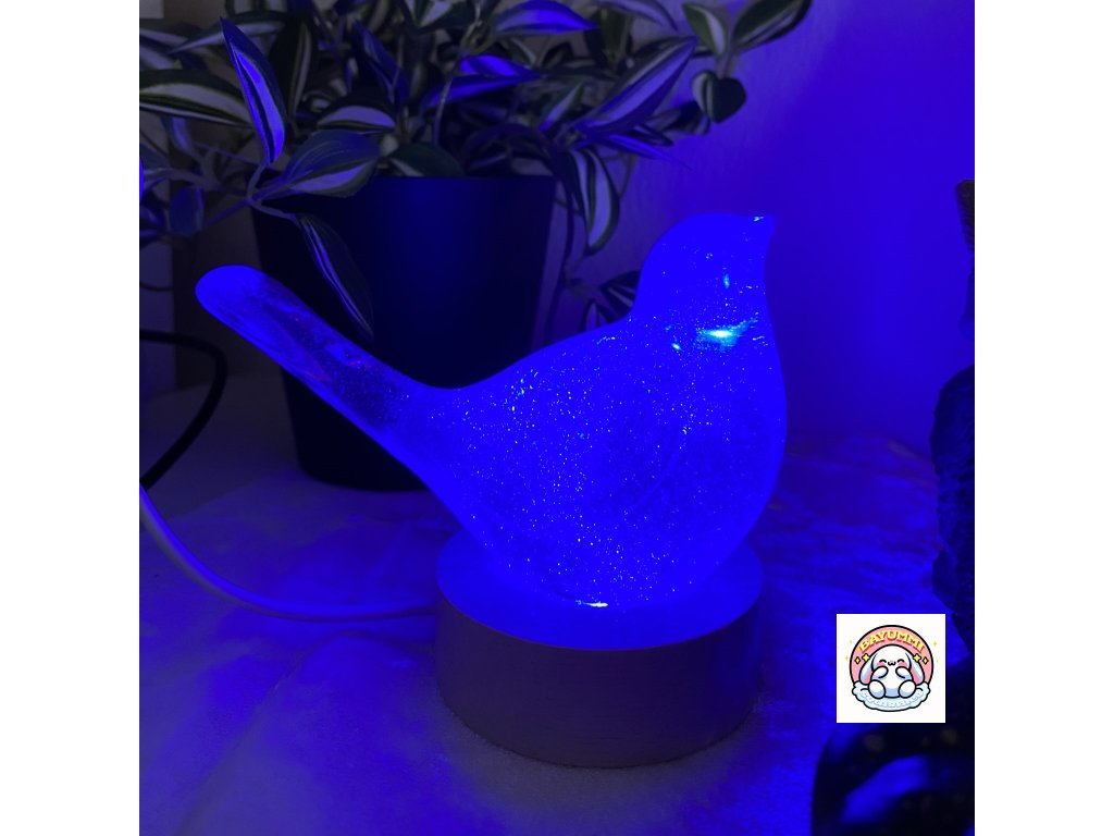 Pryskyřicový ptáček na dřevěném led podstavci na usb. Světélko mění barvy.